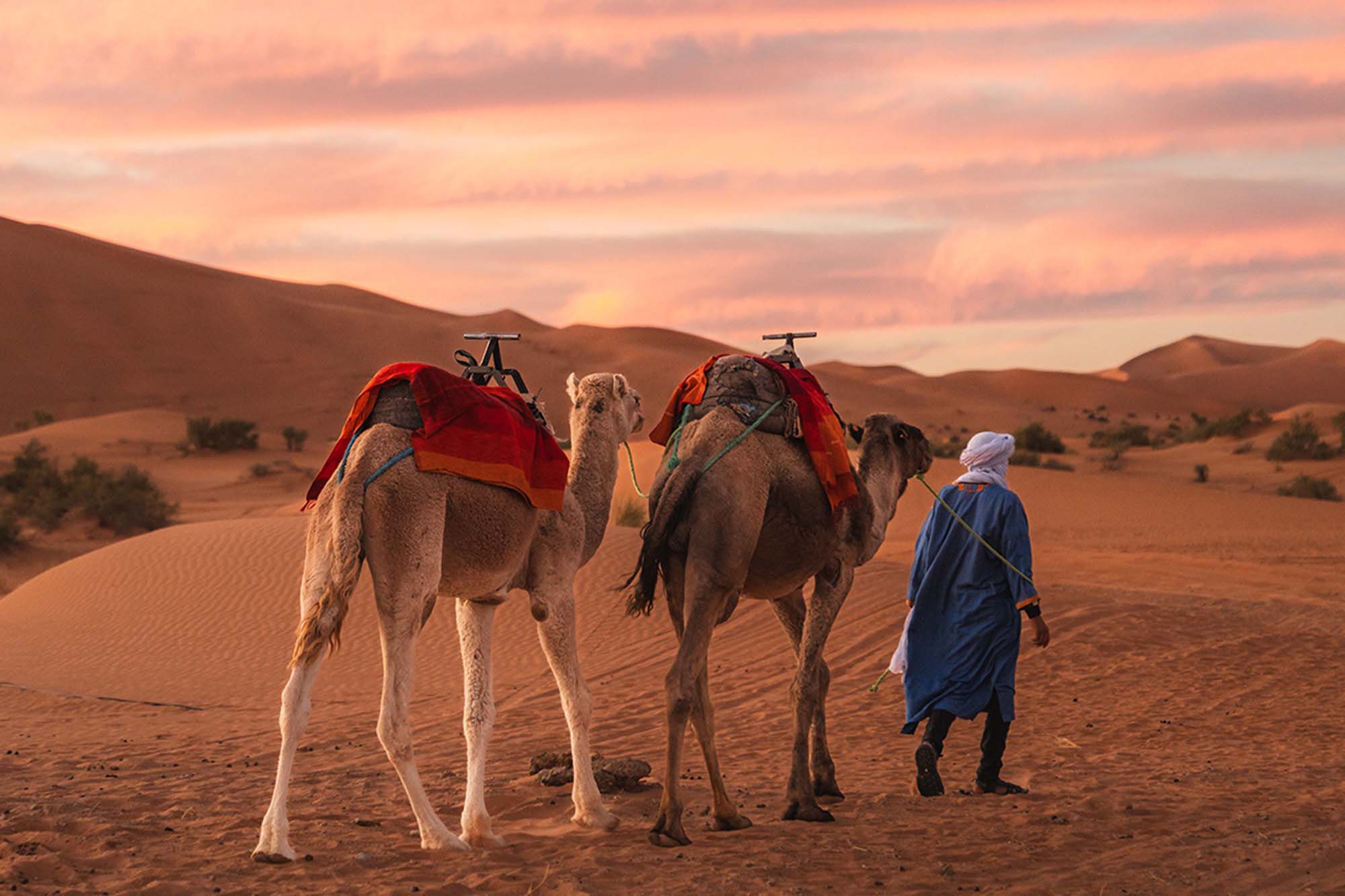 Here, we embark on a camel trek, the traditional way to navigate the soft sand dunes, and arrive at our desert camp. Enjoy a welcome tea, a delicious dinner, and the mesmerizing night sky filled with stars before retiring to one of the comfortable Berber tents for an unforgettable overnight stay.